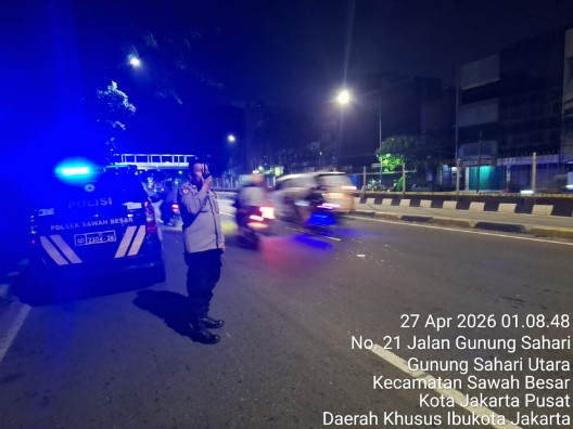 Jakarta Pusat – Personel Polsek Sawah Besar bergerak cepat menindaklanjuti laporan masyarakat melalui layanan 110 terkait adanya aksi balap liar di Jalan Gunung Sahari Raya, Sawah Besar, Jakarta Pusat, Senin (27/4/2026) sekitar pukul 01.00 WIB. Kegiatan penindakan dipimpin Panit Samapta 1 Aiptu Anwar Udin bersama tiga personel lainnya, serta didukung anggota patroli di bawah pimpinan Iptu Syafrizal (Sabar 11). Petugas langsung menuju lokasi dan melakukan pembubaran terhadap para pelaku serta kerumunan warga guna mencegah potensi gangguan kamtibmas.