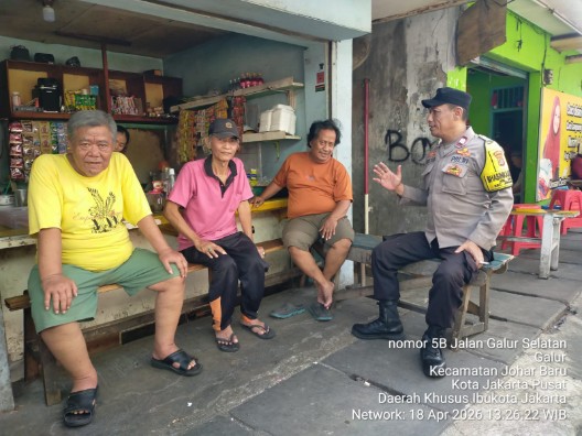 Jakarta Pusat – Dalam upaya menjaga situasi keamanan dan ketertiban masyarakat tetap kondusif, Bhabinkamtibmas Kelurahan Galur Aiptu Baktiar melaksanakan patroli dan sambang warga di wilayah RW 01, tepatnya di sebuah warkop di Jalan Galur Selatan RT 02/01, Johar Baru, Sabtu (18/4/2026) pukul 13.30 WIB.