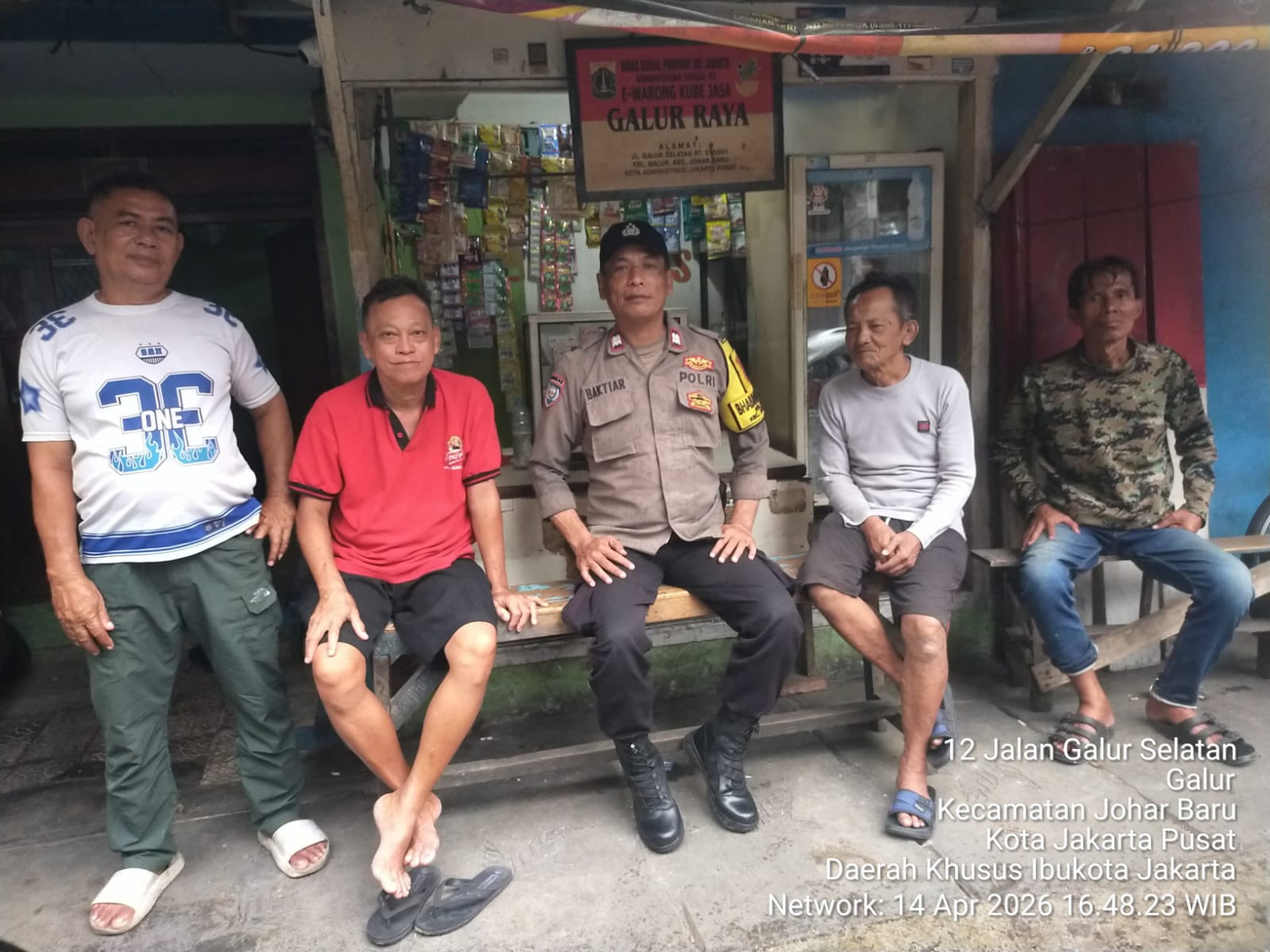 Kegiatan berlangsung di salah satu warung kopi di Jalan Galur Selatan RT 014/01, di mana Bhabinkamtibmas Aiptu Baktiar berdialog langsung dengan warga, di antaranya Bapak Itok serta masyarakat sekitar. Suasana santai dimanfaatkan untuk mempererat komunikasi sekaligus menyampaikan pesan-pesan kamtibmas.