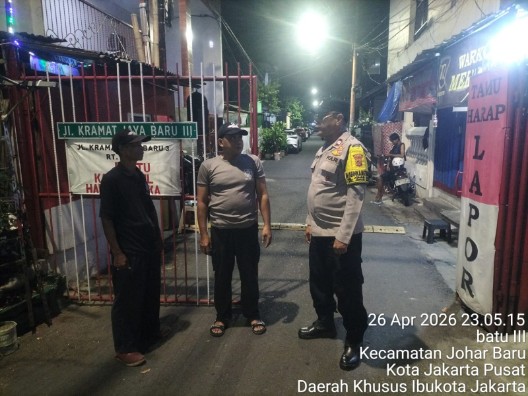 Jakarta Pusat – Upaya menjaga keamanan lingkungan terus diperkuat jajaran Polsek Johar Baru melalui kegiatan sambang pos keamanan lingkungan (satkamling) di wilayah permukiman warga. Kegiatan ini dilaksanakan pada Minggu (26/4/2026) sekitar pukul 23.00 WIB di Poskamling RT 15/RW 01, Jalan Kramat Jaya Baru 2 dan 3, Kelurahan Johar Baru, Jakarta Pusat.