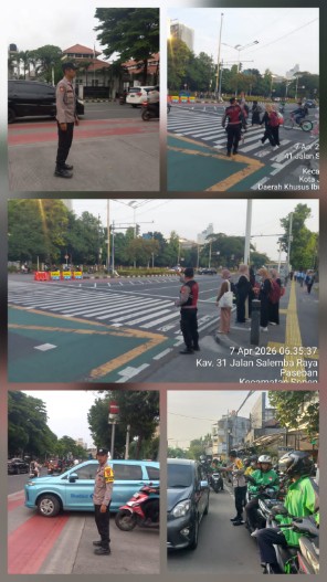 Jakarta — Personel Unit Samapta Polsek Senen melaksanakan kegiatan pelayanan pagi berupa pengaturan lalu lintas di sejumlah titik rawan kepadatan di wilayah Senen, Selasa (7/4/2026).
