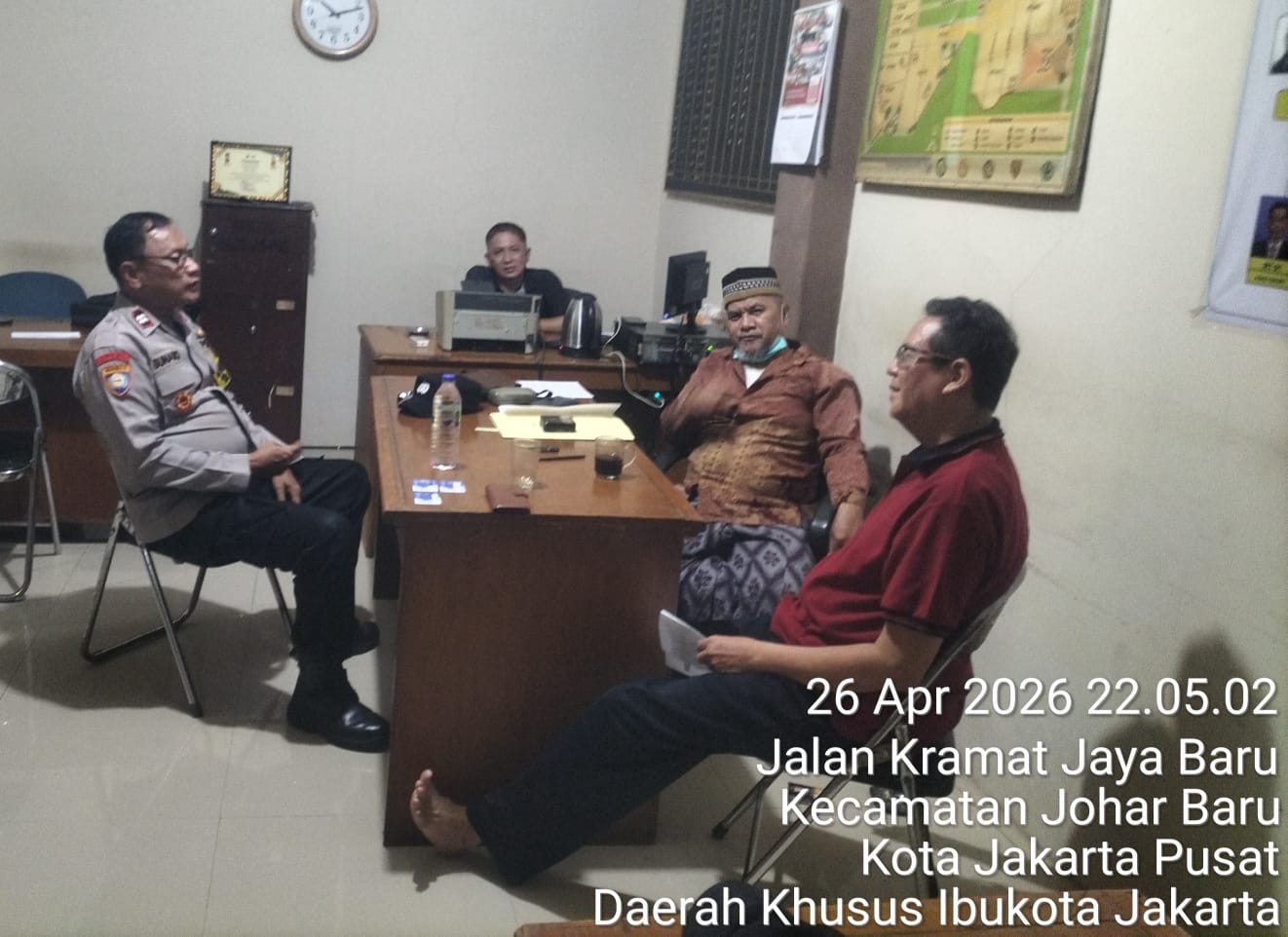 Kegiatan yang berlangsung sekitar pukul 22.25 WIB tersebut dilaksanakan oleh Bhabinkamtibmas Kelurahan Johar Baru, Aiptu Sunarto, dengan menyambangi Sekretariat RW 01 di Jalan Kramat Jaya. Dalam kegiatan tersebut, petugas berdialog langsung dengan sejumlah tokoh masyarakat, di antaranya Ketua RW 01 Syahroni Daud, Sekretaris RW Pak Iwan, serta perwakilan LMK Chaerullah.